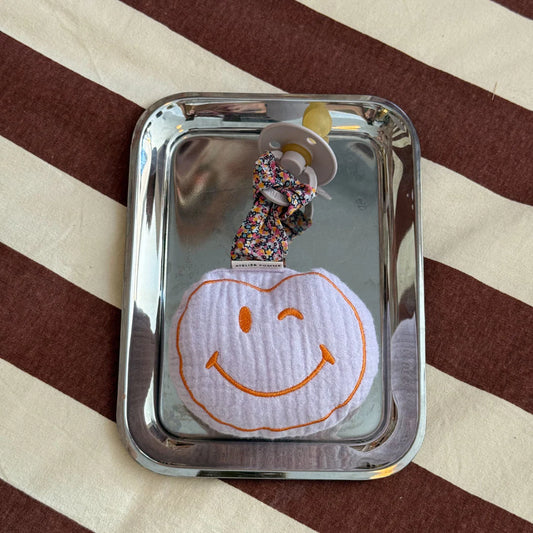Our day one happy maker! The cute apple is the POMME CUDDLE, a sweet smiley that guards the pacifier.