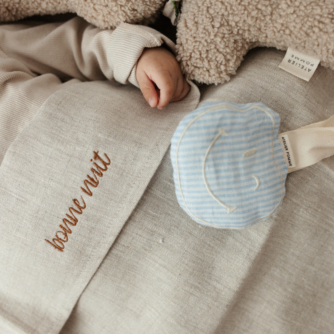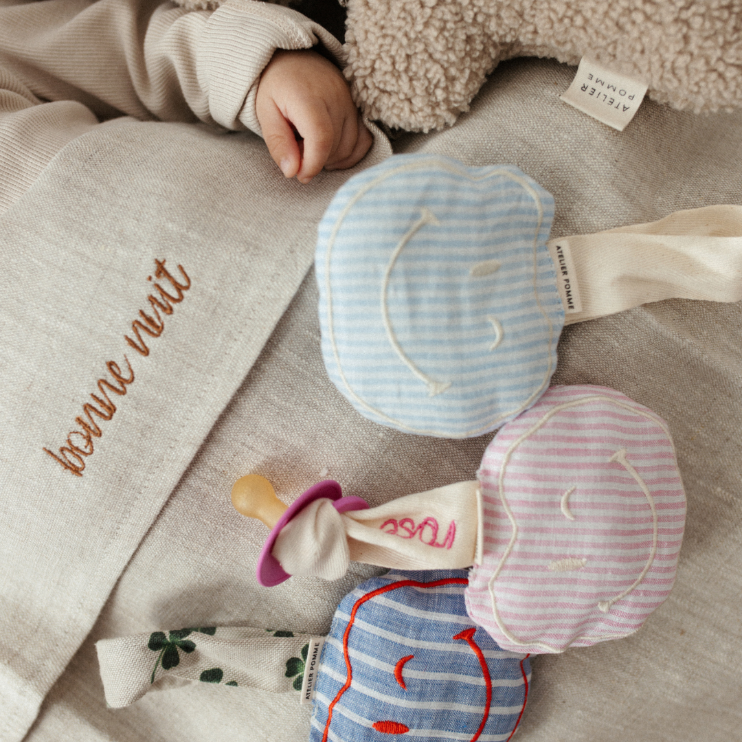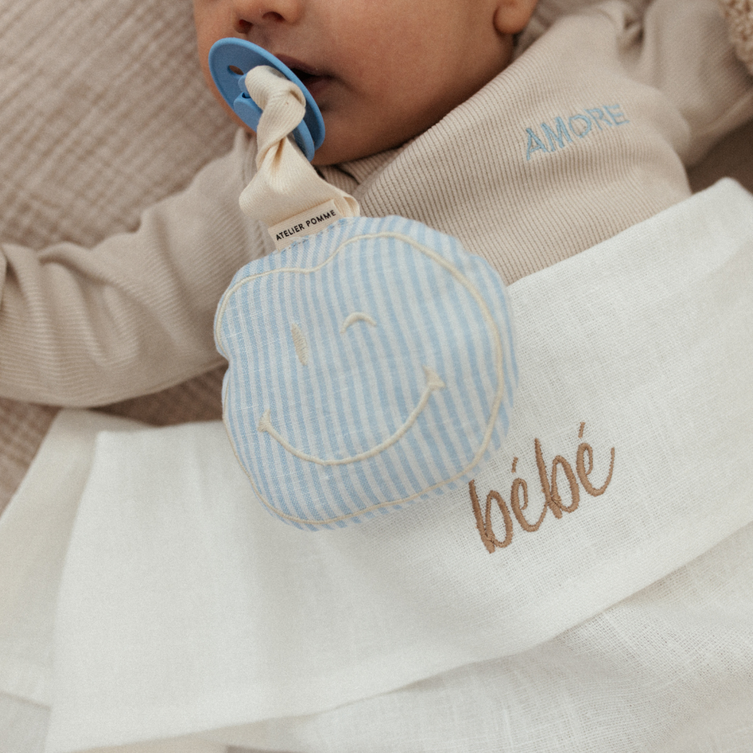 Hi there, my happy friend! Our day one happy maker! The cute apple is the POMME CUDDLE, a sweet smiley that guards your little one pacifier. The cuddle is made of super soft muslin cotton and has a cord to which you can attach a pacifier. POMME CUDDLE also loves to cuddle a lot with your baby. POMME is available in different cheerful colors with a cute print on the back!