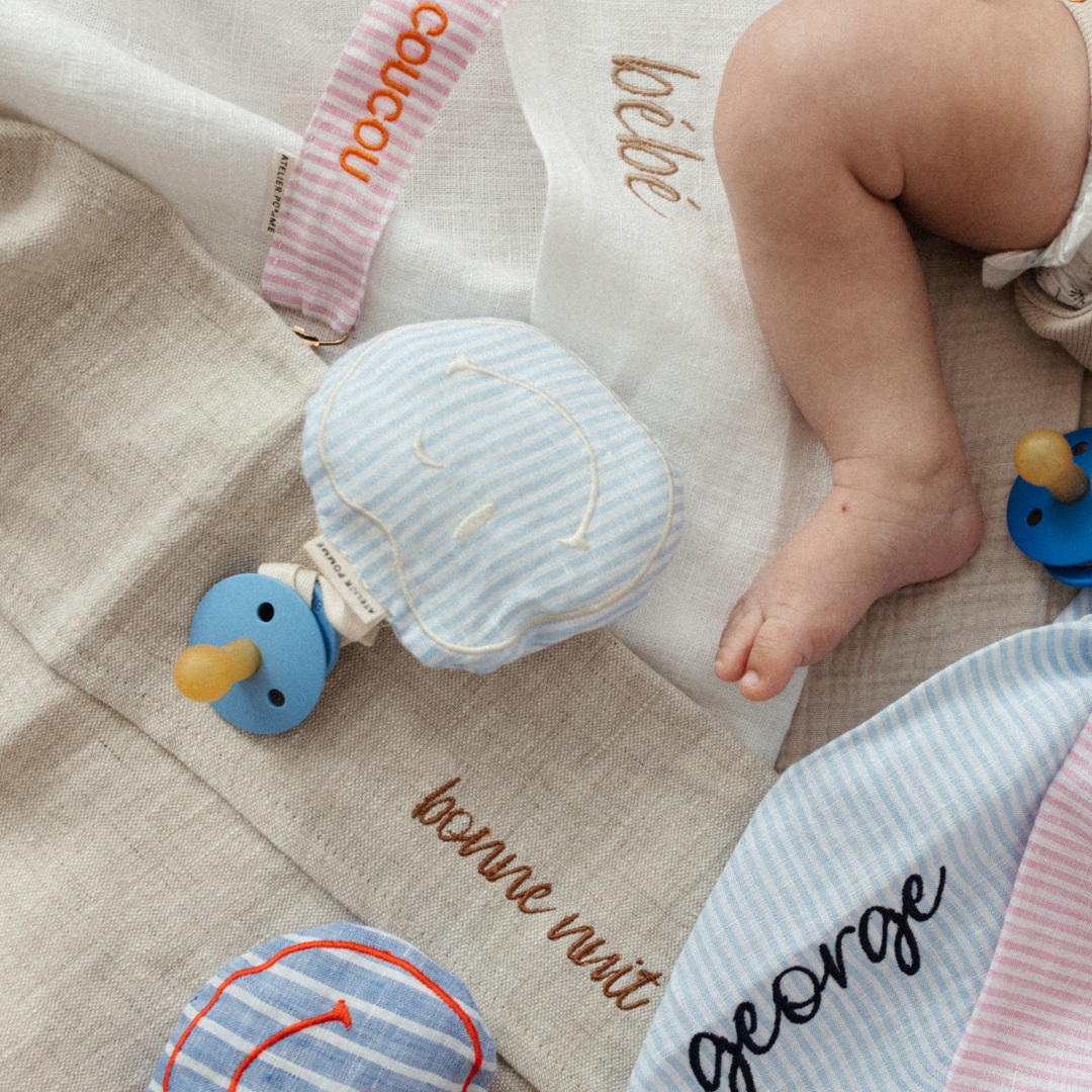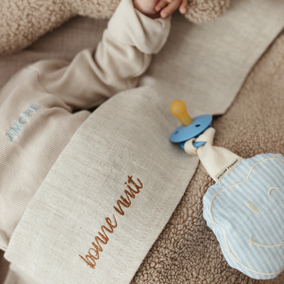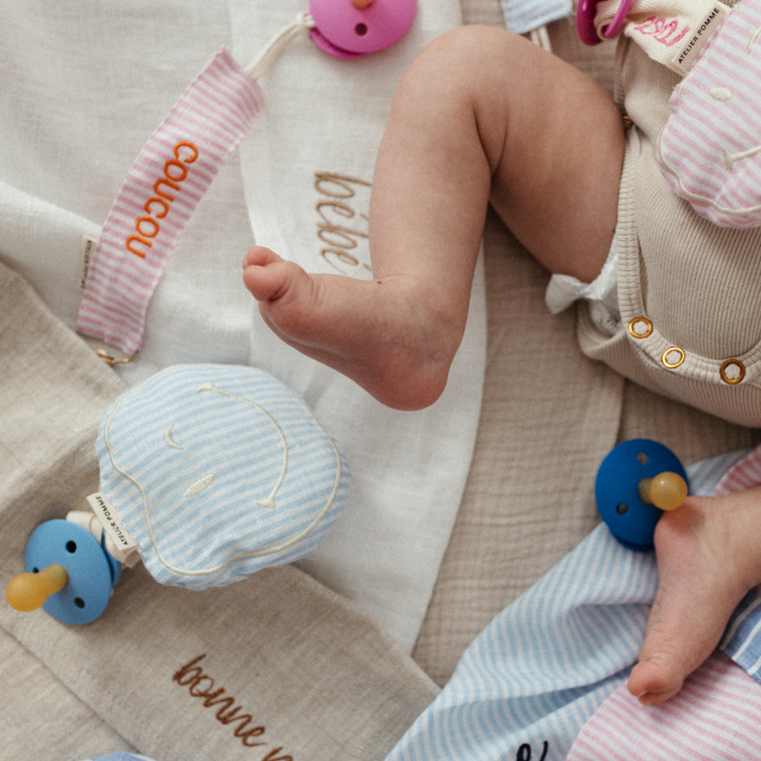 Hi there, my happy friend! Our day one happy maker! The cute apple is the POMME CUDDLE, a sweet smiley that guards your little one pacifier. The cuddle is made of super soft muslin cotton and has a cord to which you can attach a pacifier. POMME CUDDLE also loves to cuddle a lot with your baby. POMME is available in different cheerful colors with a cute print on the back!