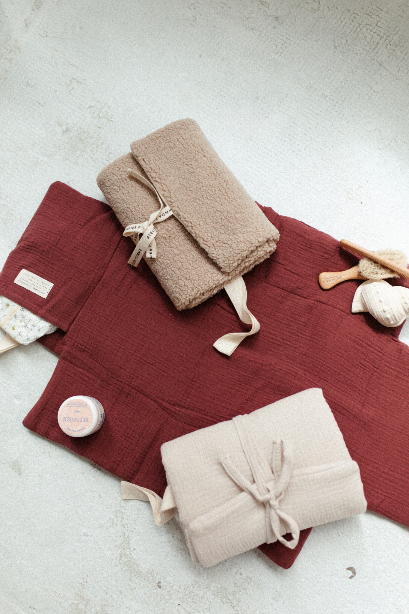 For moms, dads, and beebs on the road we have the BUMPY On THE ROAD changing mat. Ideal to wrap all your baby needs into a compact package. And… you can change your baby anytime, anywhere on this super-soft muslin mat. The BUMPY ON THE ROAD is a good size and a pocket on the inside that fit diapers and cloths. Handy! Also cute to personalize with the name of your baby!