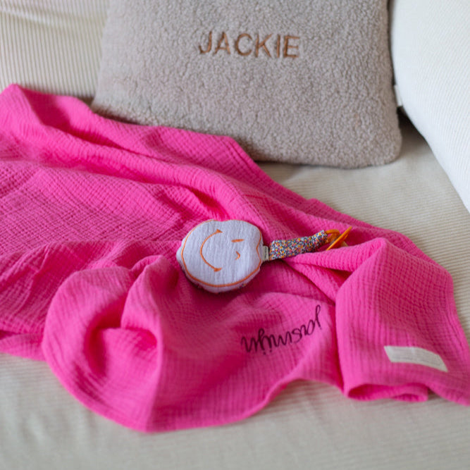 The HUGE swaddle that catches all your little one’s bubs & burps. This hydrophilic cloth is a HERO for all newborn moms and dads, because the HUGE TOWEL is, as the name suggests, nice and big (75x 75), making it perfect for an extra layer on the crib, stroller, or over your shoulder to catch the milkburbs ;-). The HUGE towel is made of 100% organic muslin cotton, which is super-soft and durable. Tip: personalize the HUGE TOWEL with POMME icons or the name of the baby for the perfect birth gift.