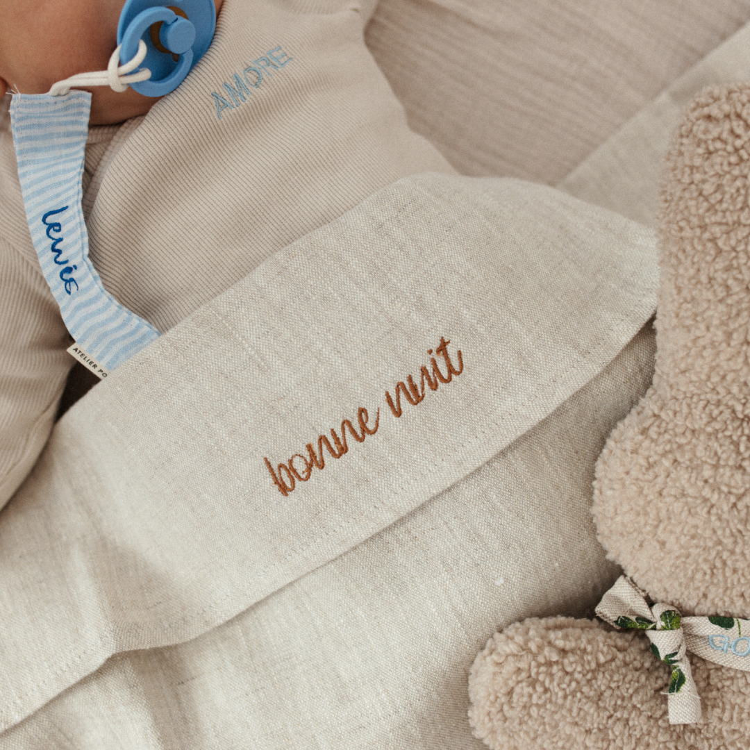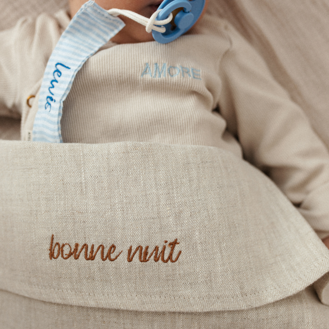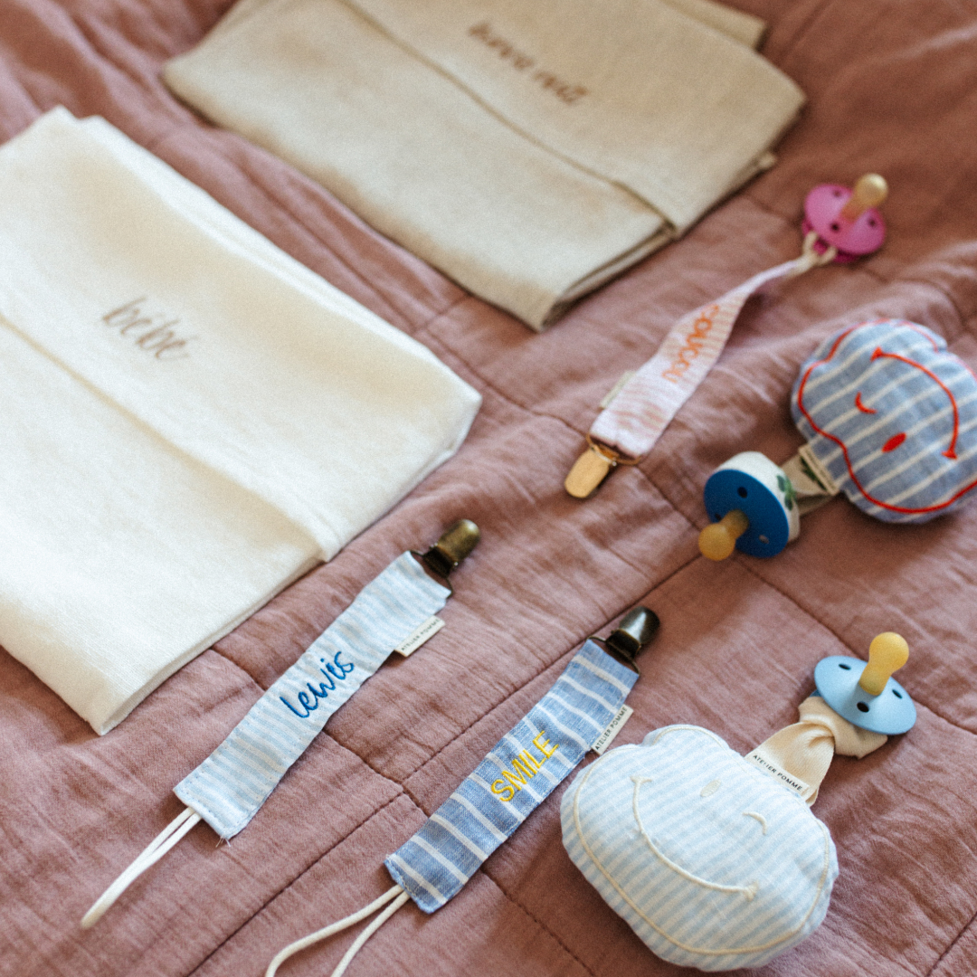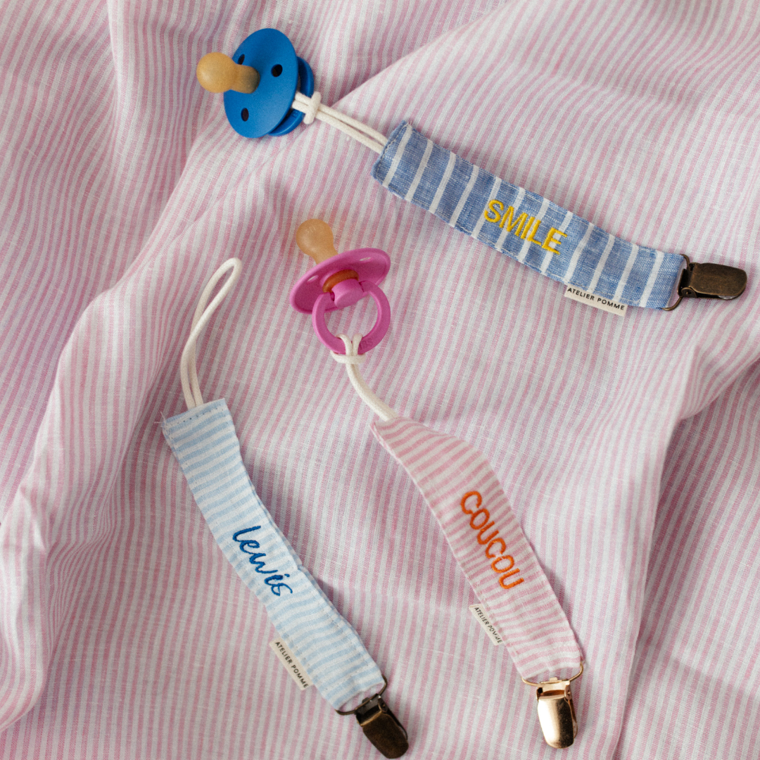 Nothing more annoying than losing a pacifier while your baby is inconsolable. That will never happen again with the KEEP-IT-CLOSE PACIFIER CORD! You can easily attach a pacifier to our pacifier cord and the cord can be attached to your child's clothing, to a cuddle cloth or to the straps of a car seat with the accompanying clip. The KEEP-IT-CLOSE PACIFIER CORD is made from residual material. Of course you can also have the name of your child embroidered on it!