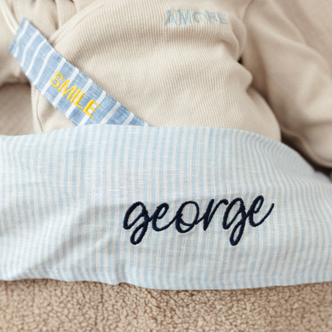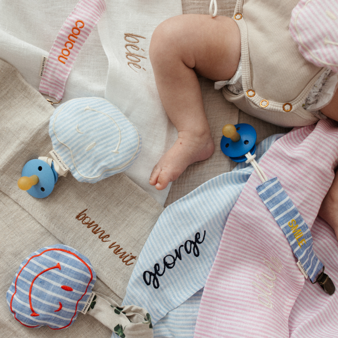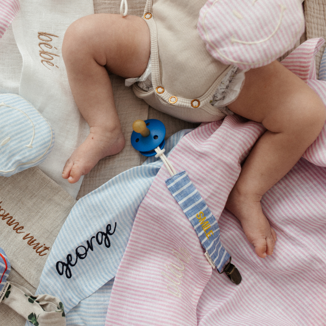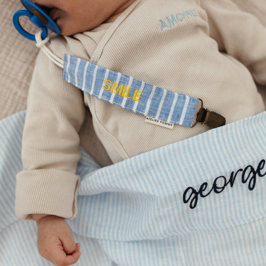 Nothing more annoying than losing a pacifier while your baby is inconsolable. That will never happen again with the KEEP-IT-CLOSE PACIFIER CORD! You can easily attach a pacifier to our pacifier cord and the cord can be attached to your child's clothing, to a cuddle cloth or to the straps of a car seat with the accompanying clip. The KEEP-IT-CLOSE PACIFIER CORD is made from residual material. Of course you can also have the name of your child embroidered on it!