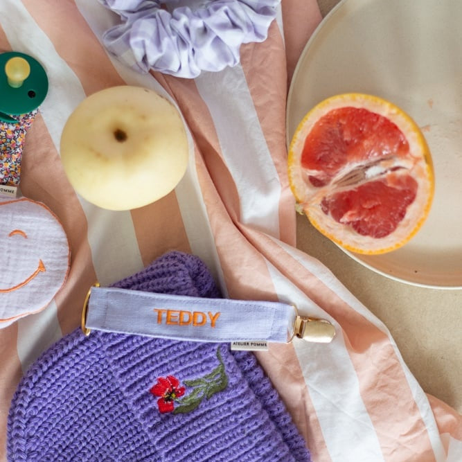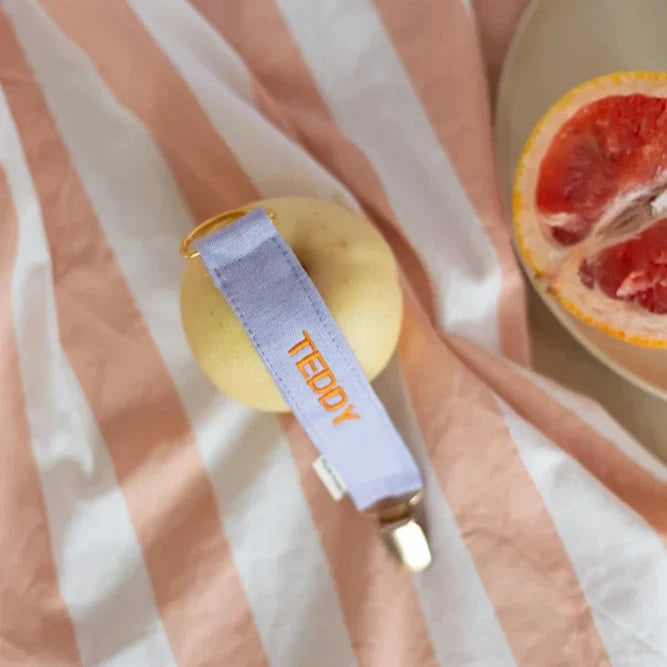Nothing more annoying than losing a pacifier while your baby is inconsolable. That will never happen again with the KEEP-IT-CLOSE PACIFIER CORD! You can easily attach a pacifier to our pacifier cord and the cord can be attached to your child's clothing, to a cuddle cloth or to the straps of a car seat with the accompanying clip. The KEEP-IT-CLOSE PACIFIER CORD is made from residual material. Of course you can also have the name of your child embroidered on it!