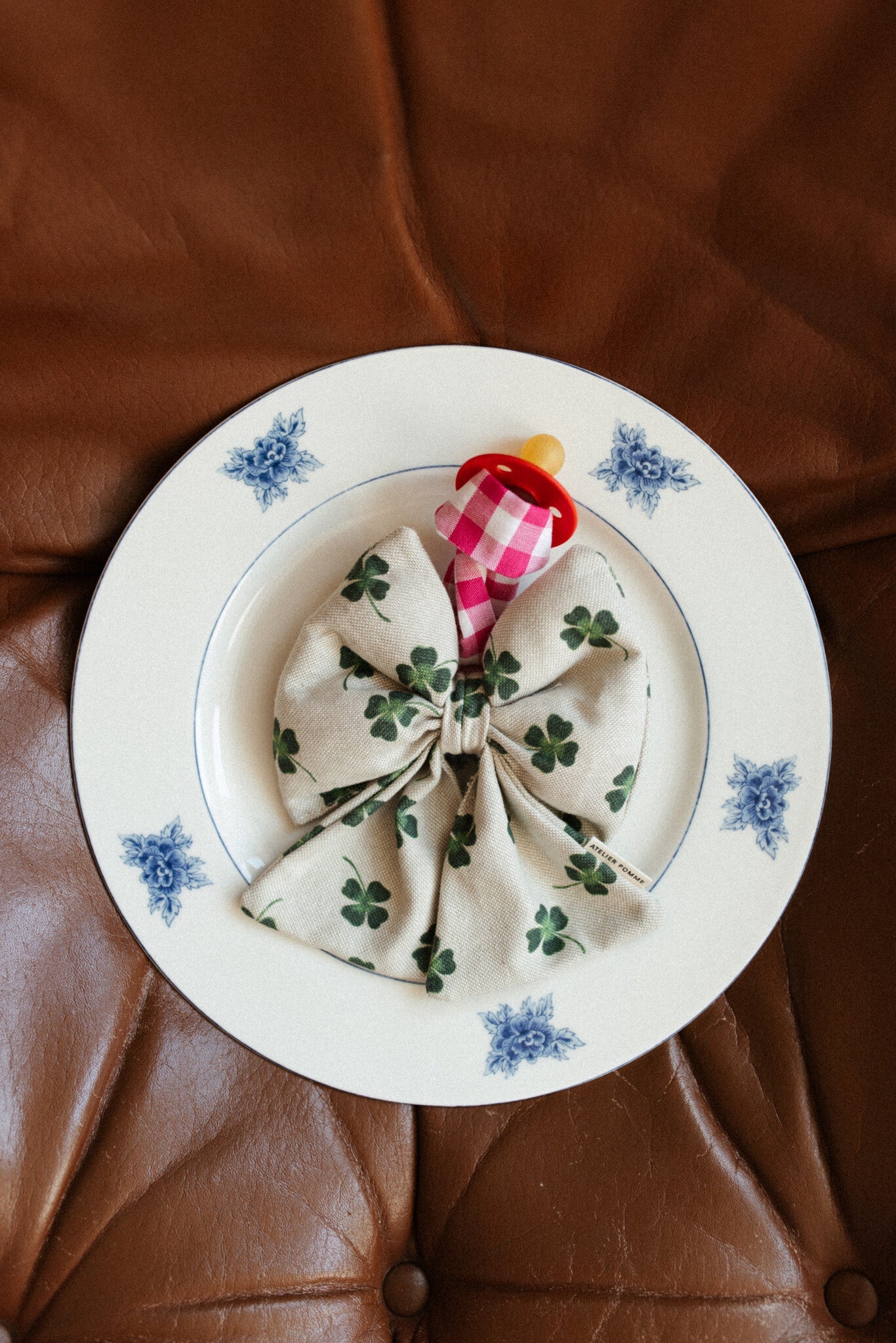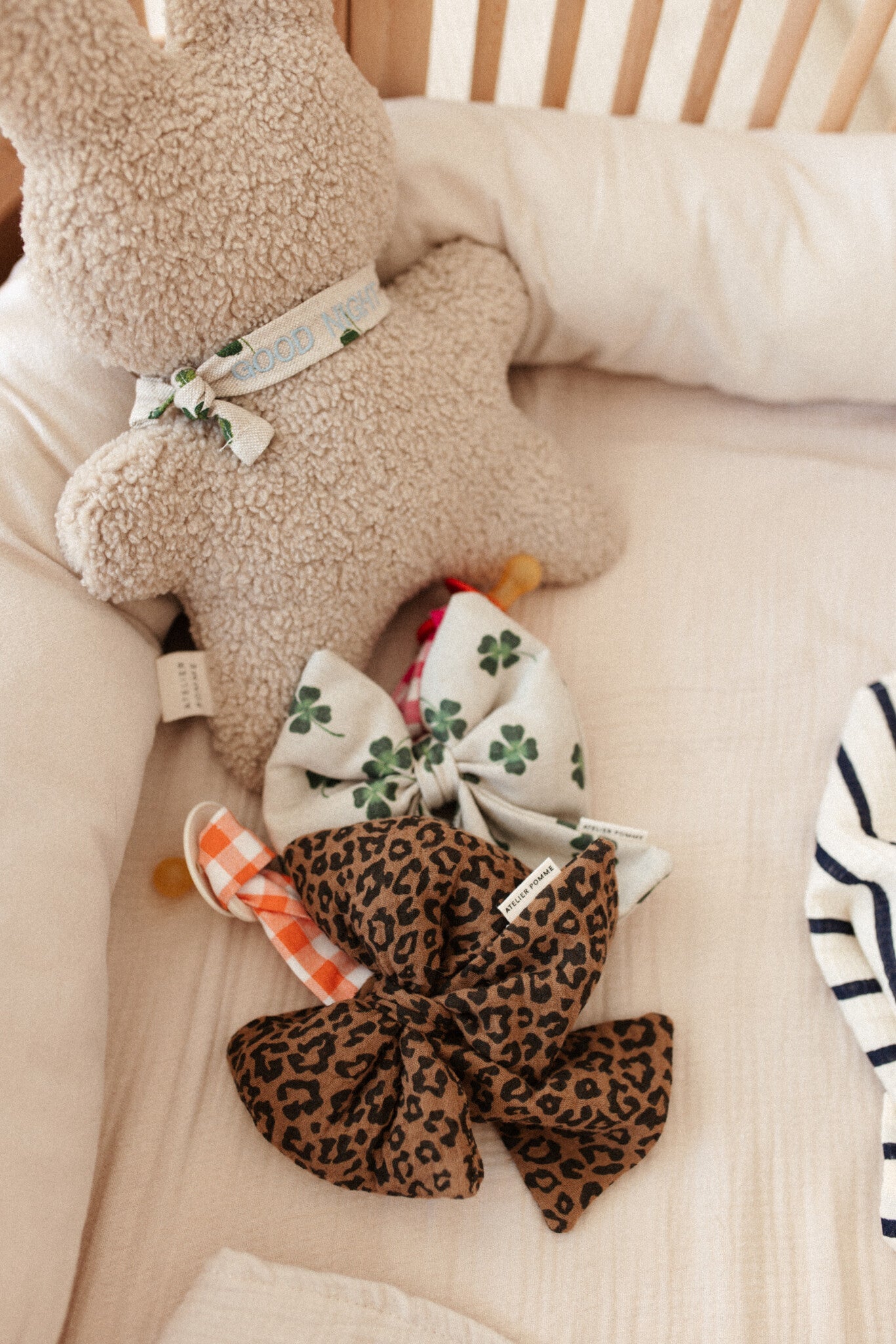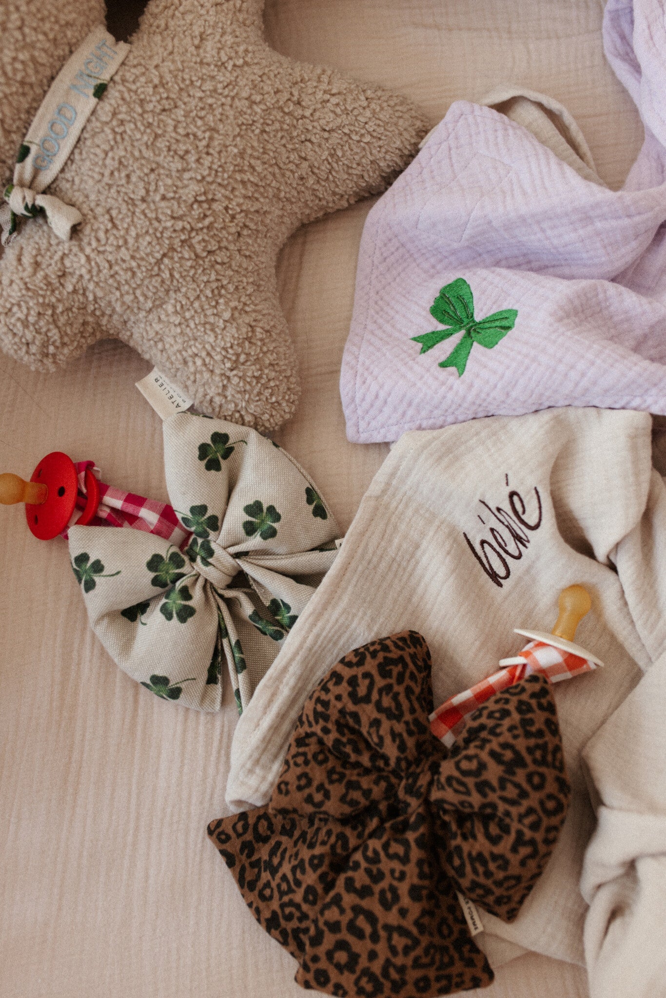 LUCKY BOW! Welcome to the world. Our bow is there to guard the little one's bibs. He prefers to cuddle with the baby and will also make life a bit easier for all mommies, because searching in your bag is now a thing of the past :)