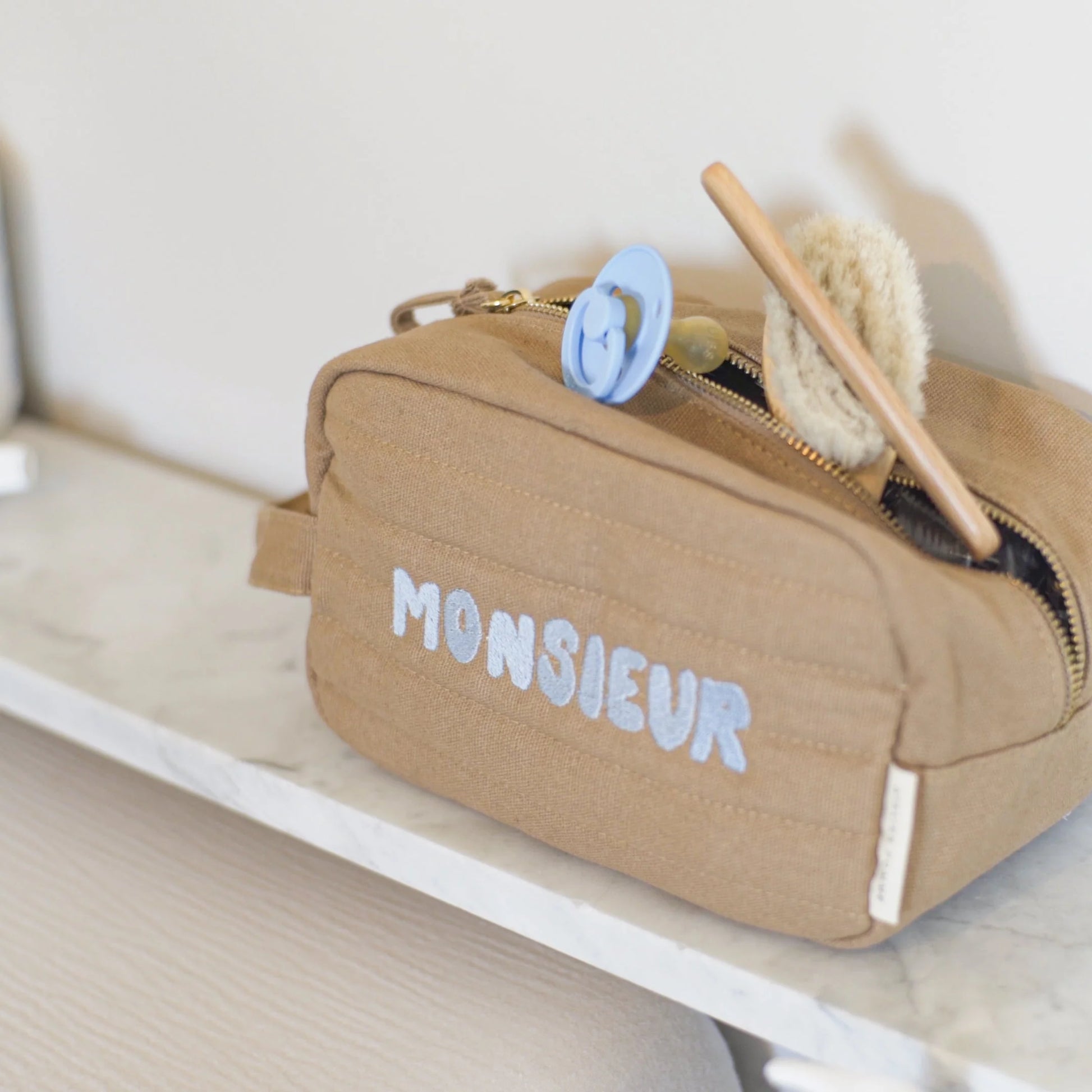 The pouch closes with a zipper so that all your belongings stay together. You can easily carry the BABY ESSENTIALS POUCH with the handy handle. The pouch is lined and made of 100% organic cotton. Make it yours by personalizing it with a name or POMME icon.