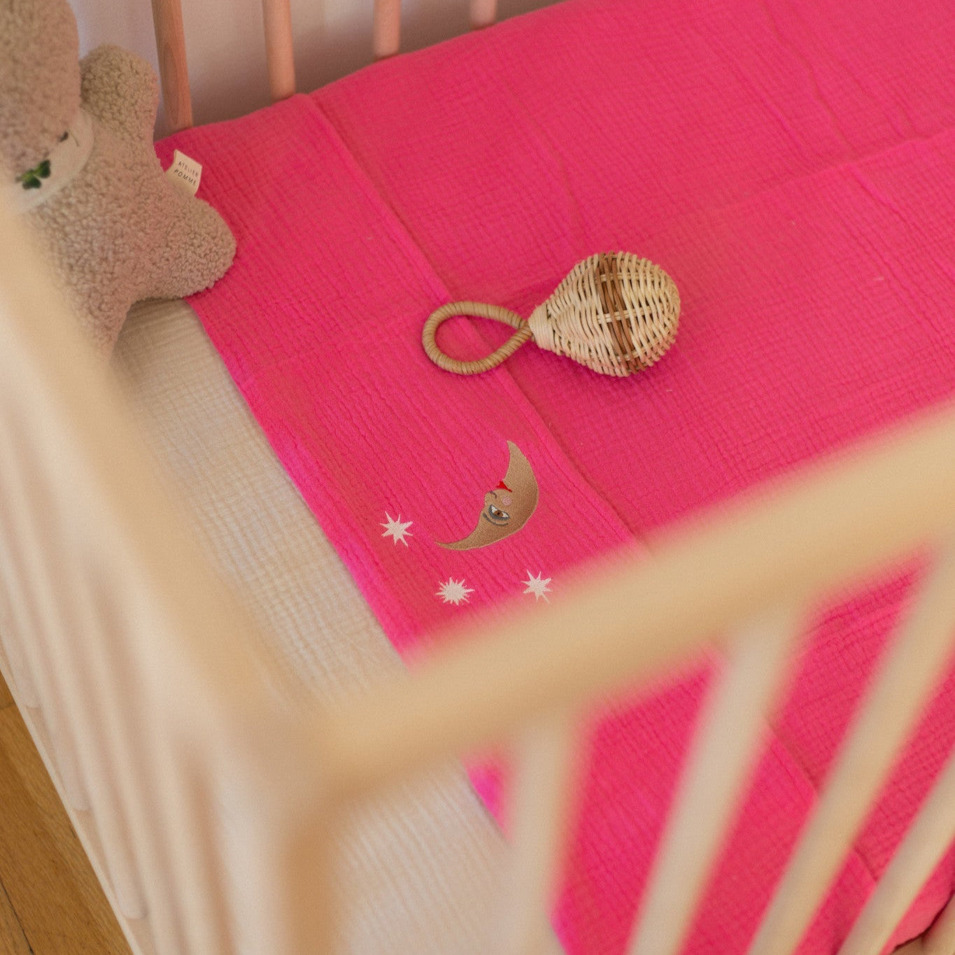 Sweet dreams with the FLAT SHEET in the crib of your mini. Use this super-soft sheet as an extra layer under the blanket. The FLAT SHEET COT is made of amazing organic and durable muslin cotton, making it super soft for the baby skin. A must-have for the bedroom of your little one, and even better with their name embroidered on it.