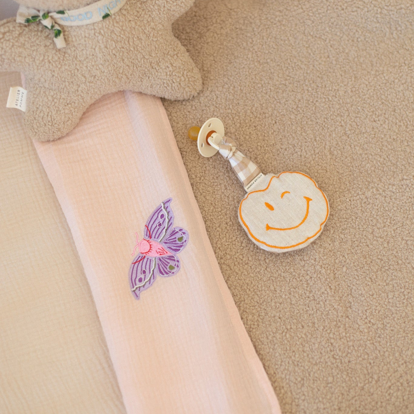 Sweet dreams with the FLAT SHEET in the crib of your mini. Use this super-soft sheet as an extra layer under the blanket. The FLAT SHEET COT is made of amazing organic and durable muslin cotton, making it super soft for the baby skin. A must-have for the bedroom of your little one, and even better with their name embroidered on it.