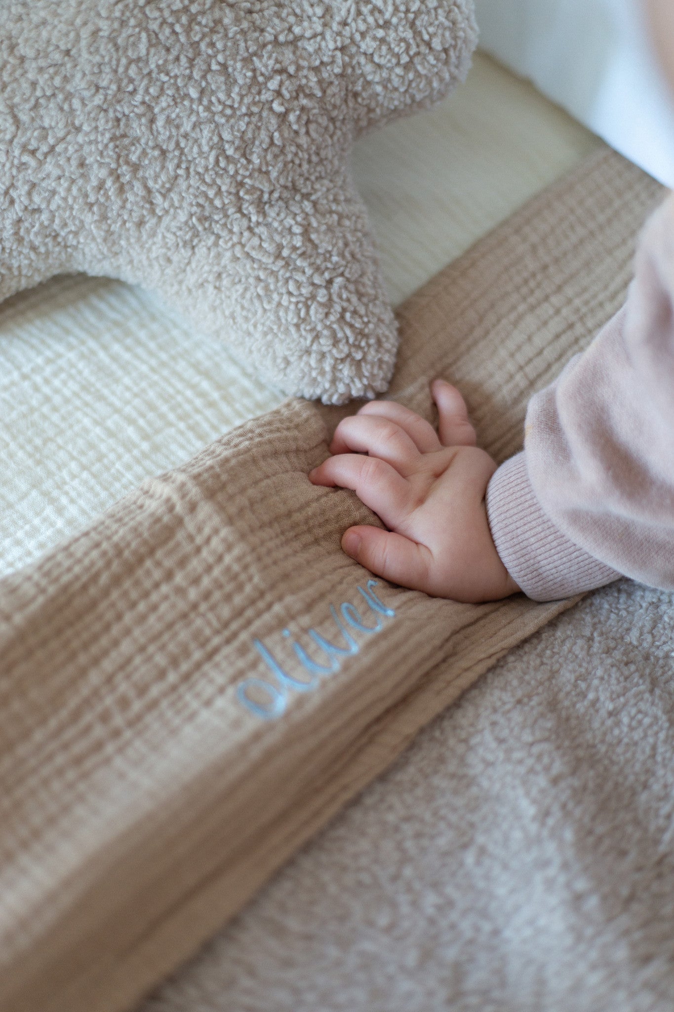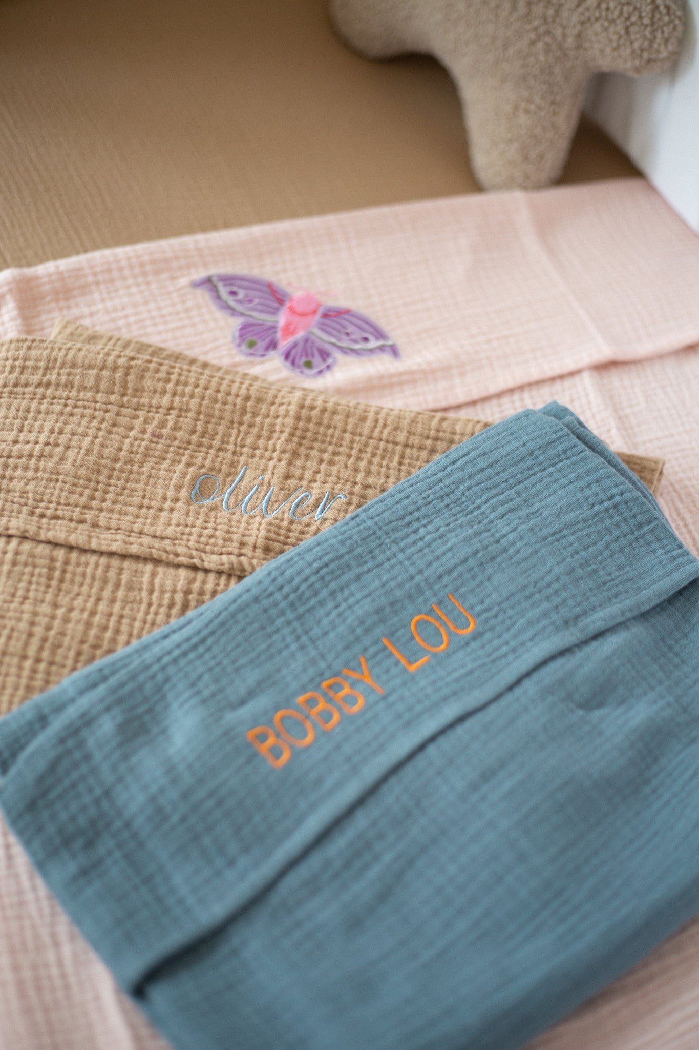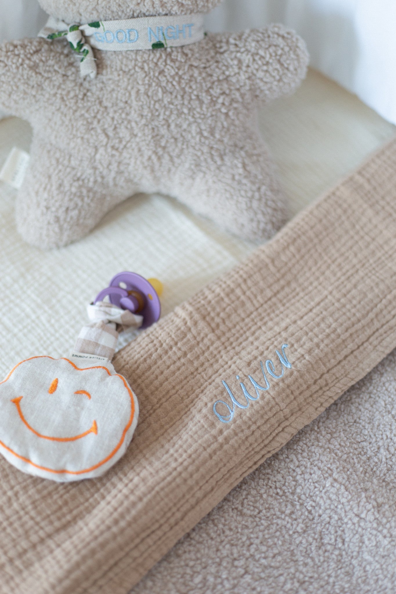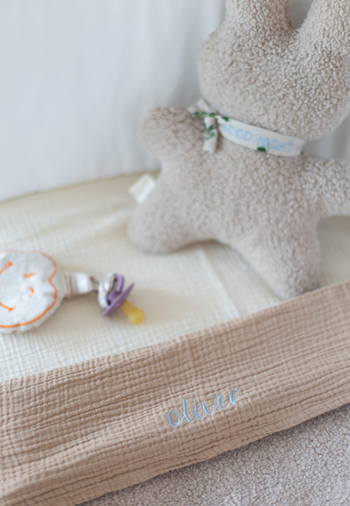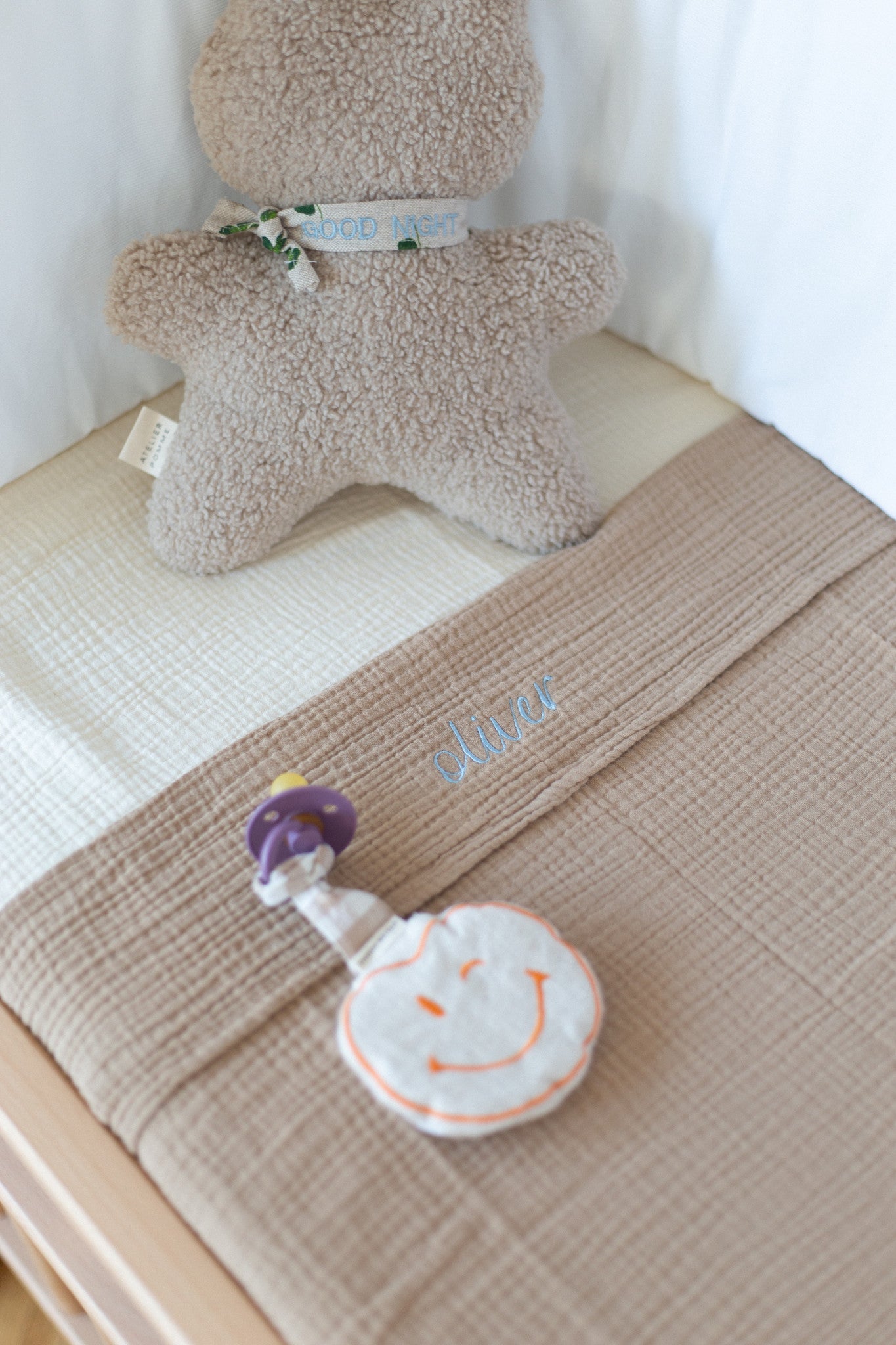 Night night! FLAT SHEET are the softest crib sheet for your baby, as an extra layer under the blanket in the crib or co-sleeper. The sheet is made of amazing organic and durable muslin cotton, making it super soft for the baby skin. A must-have for the bedroom of your little one, and even better with their name embroidered on it.